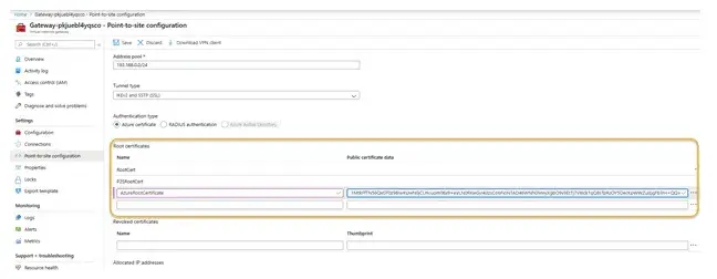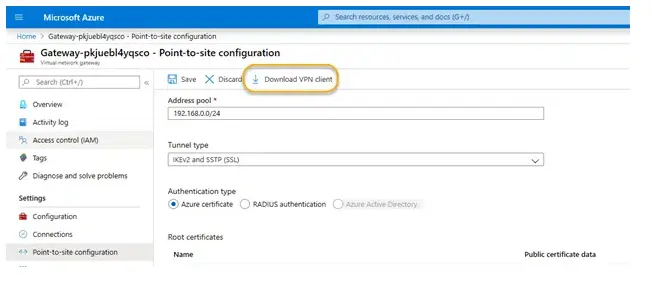 - Upload the root certificate generated in the previous step to establish trust between client devices and the VPN gateway.